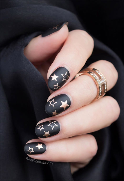 Queste unghie nere opache con stelle dorate ci ricordano di tornare a scuola e guadagnare le nostre stelle d'oro in classe. Abbraccia il look da lavagna per uno stile perfetto su cui otterrai un A+.