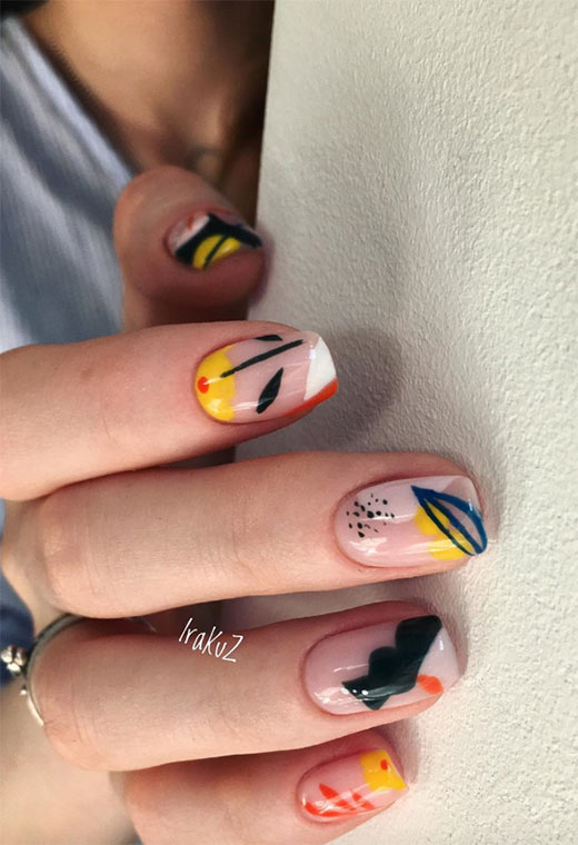 52. Unghie divertenti con ghirigori in colori caldi