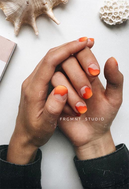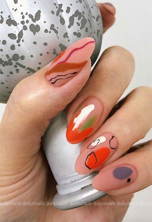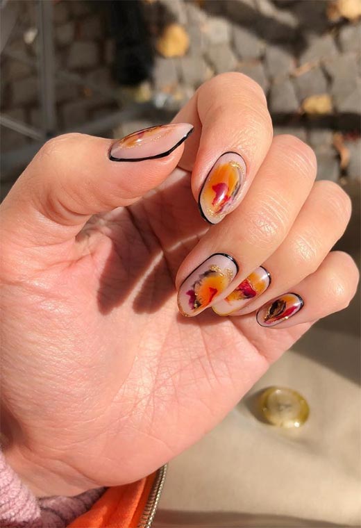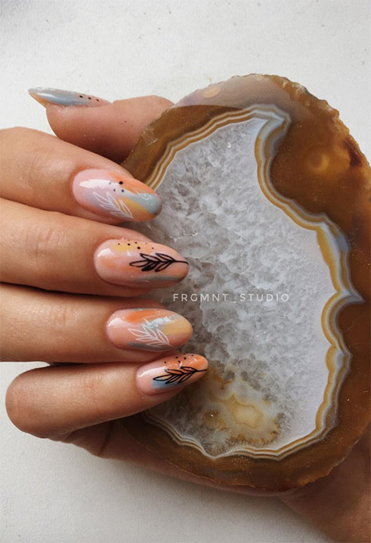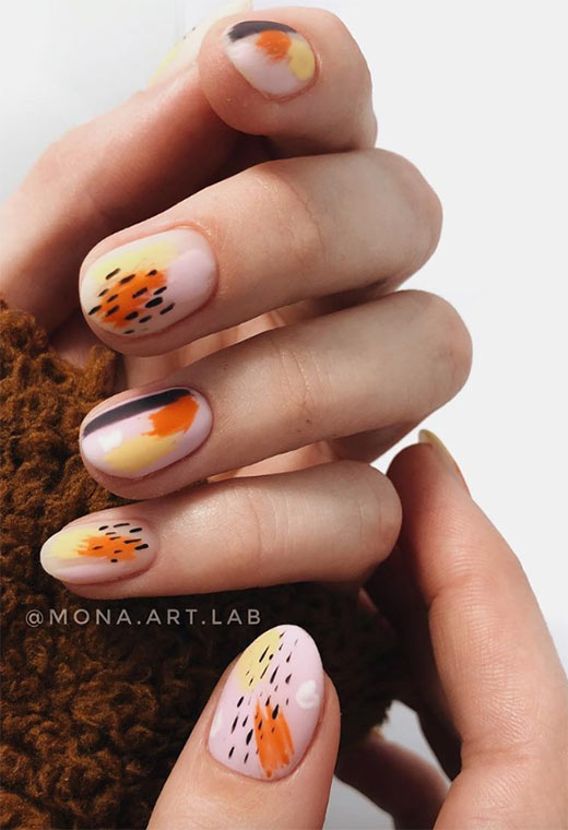 Se ami l'arancione e il rosa insieme, questo è uno dei migliori disegni per unghie autunnali per te. Le linee organiche create con lo smalto ricordano il pendio naturale di colline ricoperte di foglie e tramonti coperti di nuvole.