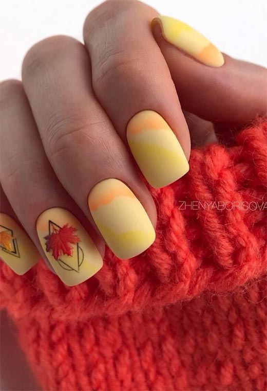 Questi graziosi disegni di unghie autunnali sono sofisticati con lo stile delle unghie dipinte a metà. Cambia i colori intorno al viola, giallo, o rosso per il tuo stile personale questo autunno.