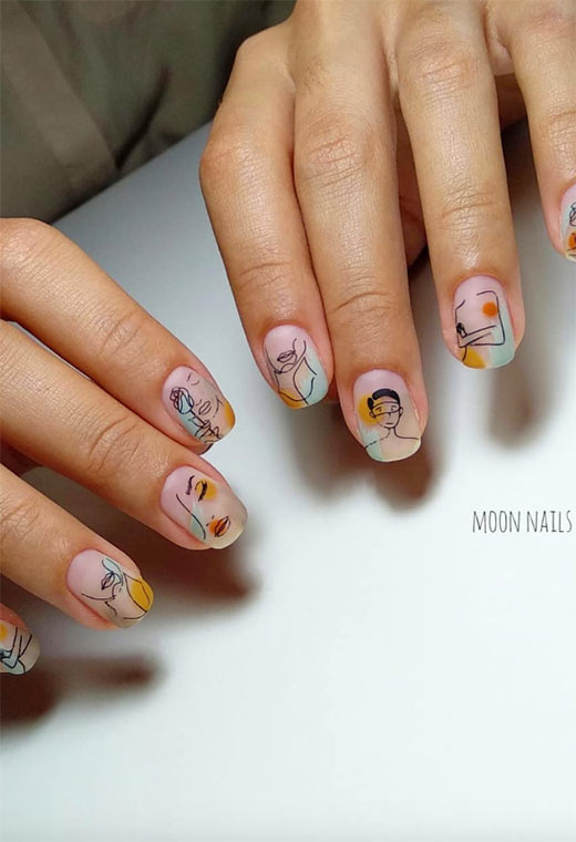 Quando si tratta di unghie autunnali minimaliste con un tocco in più, considera di provare questa nail art e prendi uno schizzo e dipingilo su più piastre per unghie. è creativo, unico, eppure semplice e spontaneo.