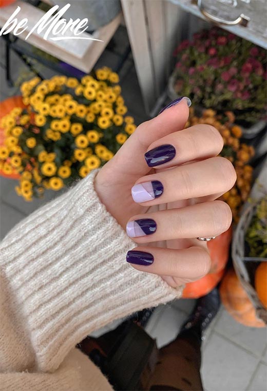 Adoriamo un bel chiodo viola qui a Glowsly. Prendi un paio di sfumature, e invece di farli fluire dall'uno all'altro in uno stile ombre, provare alcuni motivi geometrici per un fresco, idea sicura per le unghie autunnali.