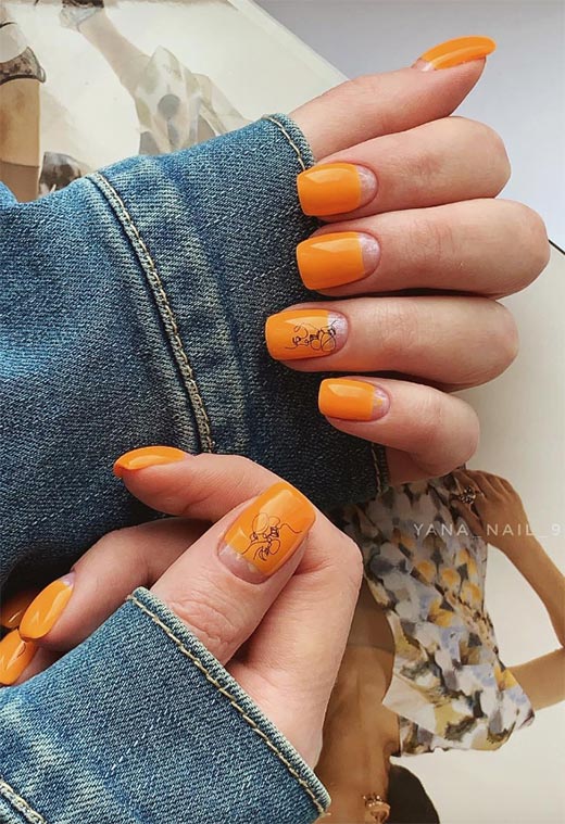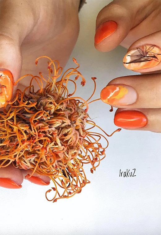 L'autunno può essere drammatico con il suo folle cambiamento di colori e i suoi venti tempestosi. Perché non copiare la sensazione sulle tue dita? Scegli una forma delle unghie più lunga per aiutare a spingere i confini mentre vai con una semplice idea di unghie autunnali con accenti di arancione.