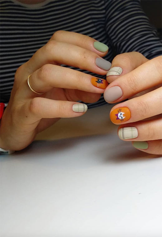 L'autunno è il momento dei caldi plaid e delle flanelle soffici. Prendi quel modello classico e mettilo sulle tue unghie in colori tenui. Non dimenticare il simpatico dettaglio del gatto!
