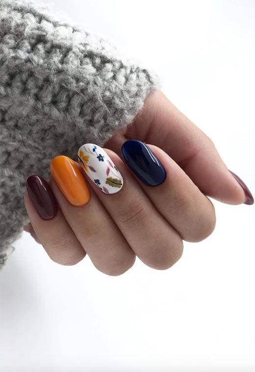 Chi dice che l'autunno è solo per le foglie? Questa nail art autunnale combina colori vivaci con elementi terrosi. Prova ad aggiungere disegni di unghie floreali e piante come felci con forme semplici per un look autunnale all'avanguardia.