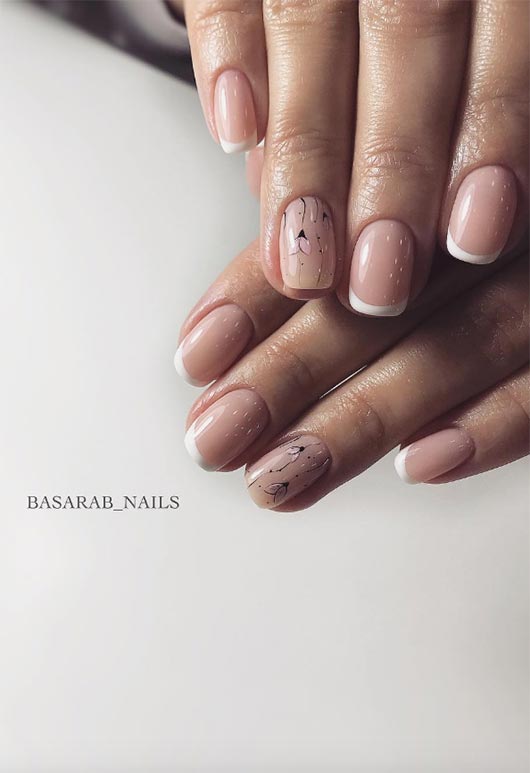 Questa french manicure è interessante e non solo per l'accento. La maggior parte delle unghie sono dipinte con uno smalto nude lusinghiero, mentre le punte stesse sono sottili come può essere, aiutando ad allungare l'unghia. Nonostante la forma quadrata delle unghie, le punte sono arrotondate, che addolcisce lo sguardo. Per quanto riguarda l'accento chiodo, è decorato con un antico motivo floreale in bianco, esaltando lo stile più morbido.