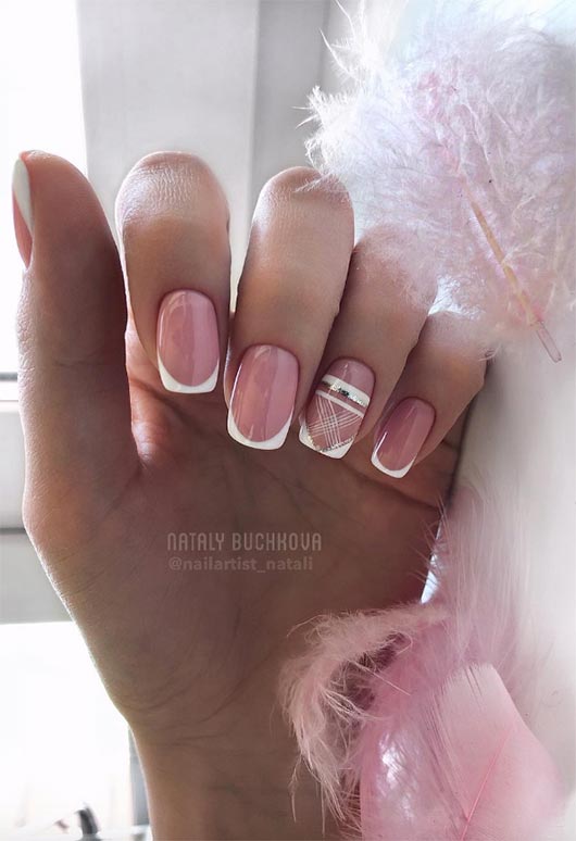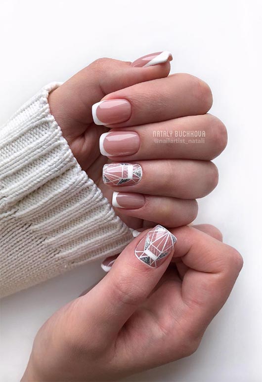 La combinazione di disegni geometrici e piccoli tocchi intelligenti di glitter è sempre avvincente. In questo disegno, quelle piccole strisce geometriche che si incrociano sull'unghia sono affascinanti e interessanti, con arte senza tempo. Una cosa che vale la pena sottolineare è che mentre la maggior parte delle unghie di questa french manicure ha una linea del sorriso arrotondata, la punta dell'unghia accento è più appuntita, che è un contrasto ponderato.