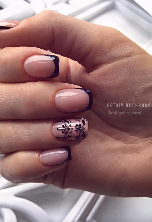 20. Punte francesi nere con motivi floreali