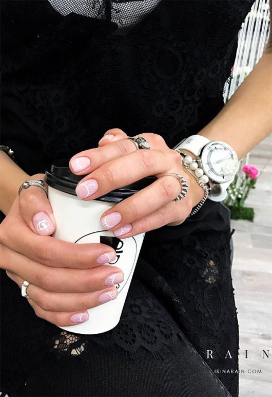 White and lighter nude colored nail polish can give skin a richer and more tanned look while maintaining a crisp manicured appearance. The lashed eyes were interesting and fun to look at, making this a lighthearted nail design for short nails that still looks fresh and neat. Even the style of the eyes is a bit abstract for another interesting aesthetic element.