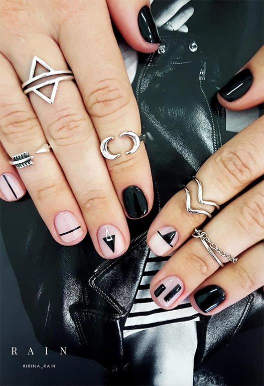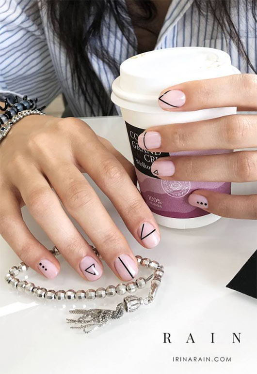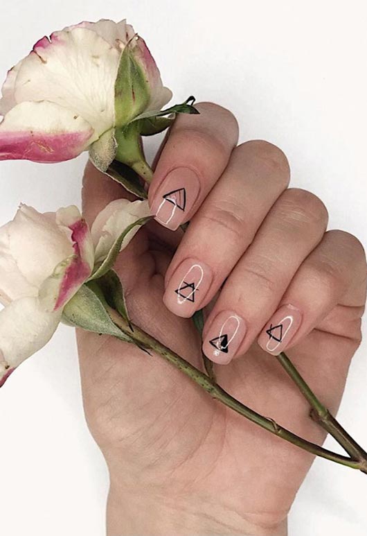 Una nail art per unghie più corte con smalto nude e disegni dipinti di nero è una scelta facile. I disegni in questo caso sono triangoli, ognuno fatto in modo leggermente diverso dall'altro per una manicure interessante. Ogni triangolo è ben posizionato per consentire il massimo utilizzo della superficie dell'unghia senza rovinare l'estetica minimalista.