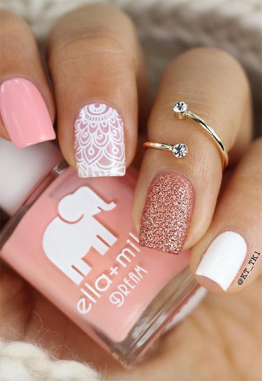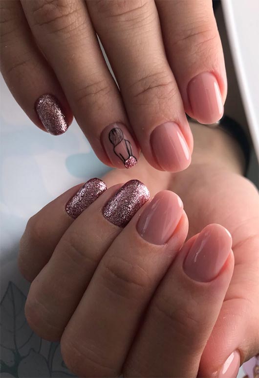 A manicure with multiple visual elements is hardly a new concept, but it can be refreshed and redone an innumerable amount of ways. This short nail design features different shades and even glitter, all of which are combined in a single design on one stand-out nail. The design on the ring finger itself is stunning, tying all of the other elements of the manicure together beautifully well.