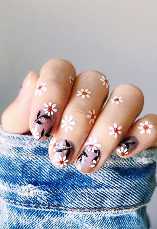 La prossima stagione della moda ha dimostrato che portare la tua nail art un po' più lontano delle tue unghie è un'idea fantastica e alla moda, ma funziona ancora meglio con le unghie più corte, poiché il design sembra ingranare meglio con le dita. Dipingere margherite sulle unghie e sulle dita dona il più completo aspetto floreale mai creato.