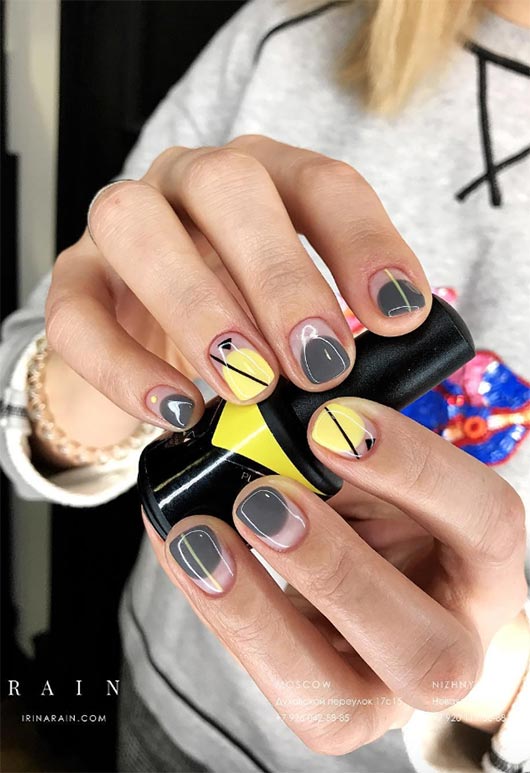 Il grigio e il giallo sono una combinazione di colori spesso trascurata che è davvero piacevole alla vista. Sotto una lucentezza lucida e mostrando lo spazio tra il colore e la cuticola, questo design per unghie per unghie corte ha alcuni elementi interessanti. Le unghie accentate presentano il giallo al posto del grigio che occupa la maggior parte dell'unghia, e aggiunge anche un po' di arte al tratto nero per un interessante punto di nota.