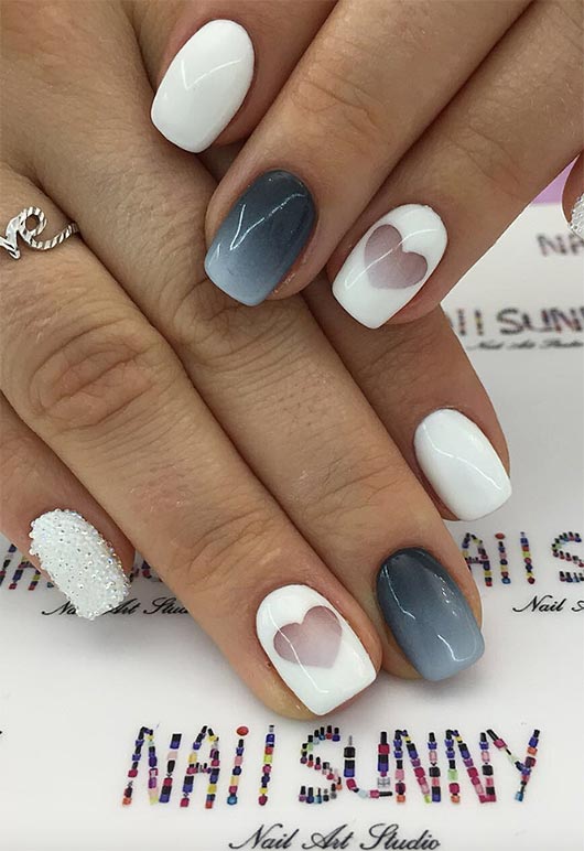 Quando la tua manicure presenta un'intera unghia di minuscoli cristalli e questa non è nemmeno la caratteristica principale, il tuo design per nail art corto è fantastico. Un cuore spaziale negativo circondato da smalto bianco è universalmente lusinghiero, ma le ombre da grigio scuro a grigio chiaro sono un accento tempestoso che non sarà trascurato.