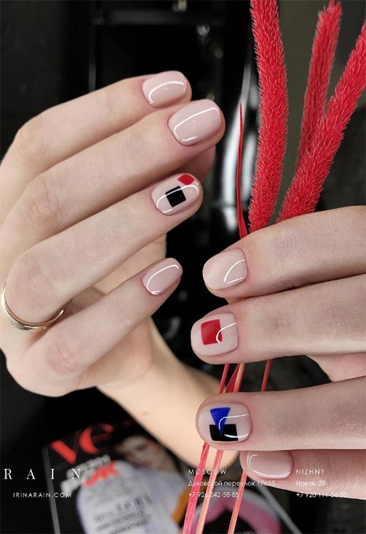 Forme geometriche in tinta unita posizionate su uno sfondo color carne e ricoperte da un cappotto lucidissimo sono un gradino sopra il resto. Le unghie nude sono un ottimo sfondo per quasi tutti i design, ma questo consente il rosso intenso, forme nere e blu per risaltare brillantemente.