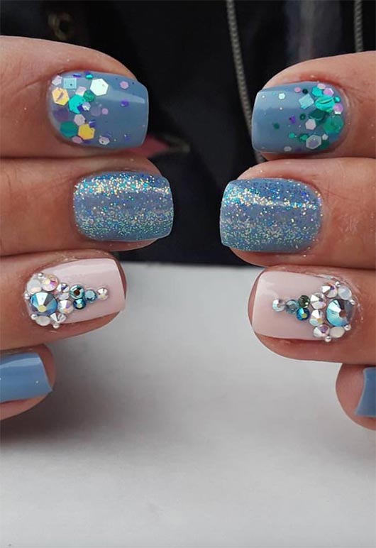 Una manicure con troppi elementi può facilmente sembrare sgargiante, ma quando il posizionamento è corretto, il look viene perfetto. Questo look molto simile a una sirena è ideale come ottimo design per unghie per unghie corte perché non occupa l'intera superficie dell'unghia. Le paillettes sono perfettamente posizionate, i brillantini e le pietre sono mantenuti separati e il design leggero e pulito.