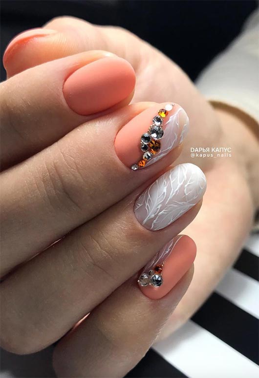 Una base di pesca decorata con piume dipinte di bianco e perla è accentata con chiare, pietre color oro e topazio. La combinazione è più che complementare:è anche strutturata per essere visivamente e fisicamente interessante. Come ulteriore passo avanti per un nail design spettacolare per unghie corte, lo smalto pesca è anche opaco, permettendo alla pietra e alla finitura di perle sotto le piume di brillare ancora di più.