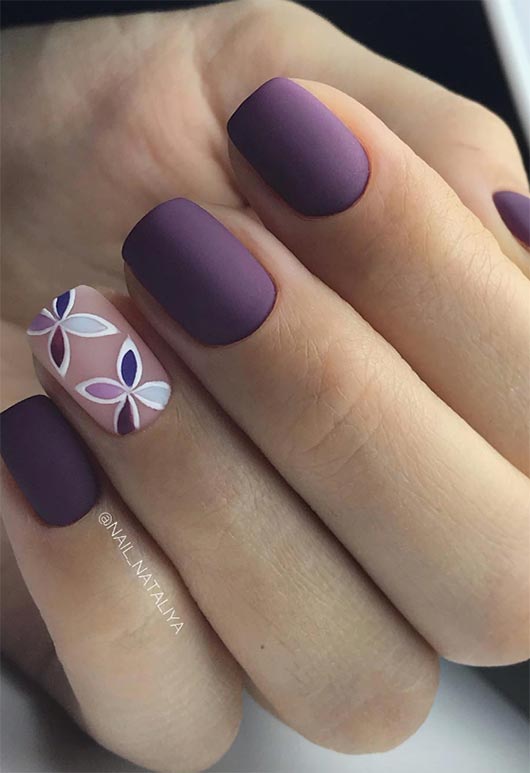 Matte fa un altro spettacolo nella lista in un bellissimo viola reale che sembra morbido sotto la finitura. L'accento chiodo, fatto nel malva più chiaro con fiori dipinti multicolori è un fantastico elemento astratto che completa bene il colore e dà un'altra dimensione a questo design per unghie corte.