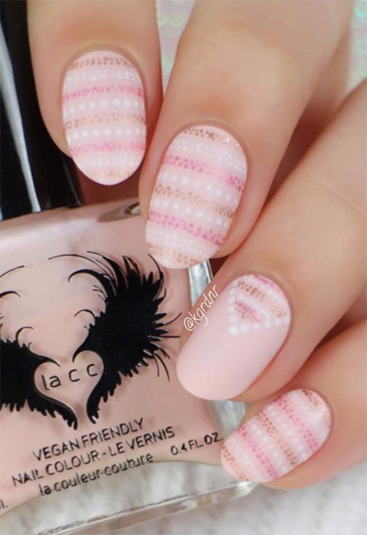 Le unghie rosa chiaro o nude con un singolo piccolo cuore stampato in un punto diverso su ogni unghia sembrano semplici, minimalista e dolcemente caotico. L'elevata brillantezza aumenta davvero la posta in gioco sul semplice design delle unghie per unghie corte, ma la caratteristica migliore è il posizionamento. Metti il cuore dove il tuo cuore desidera per un bell'aspetto.