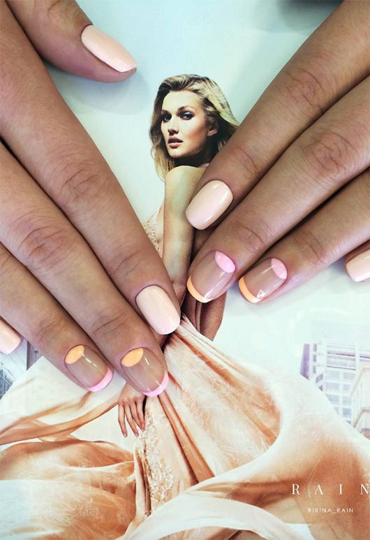 Short nail designs featuring a French tip are no longer done in the same simple way with new color combinations taking center stage. Now the resurgence of a minor style – the half moon shape at the cuticle – has come back and is paired with a painted tip. It’s a great manicure worked out on an oval tip.