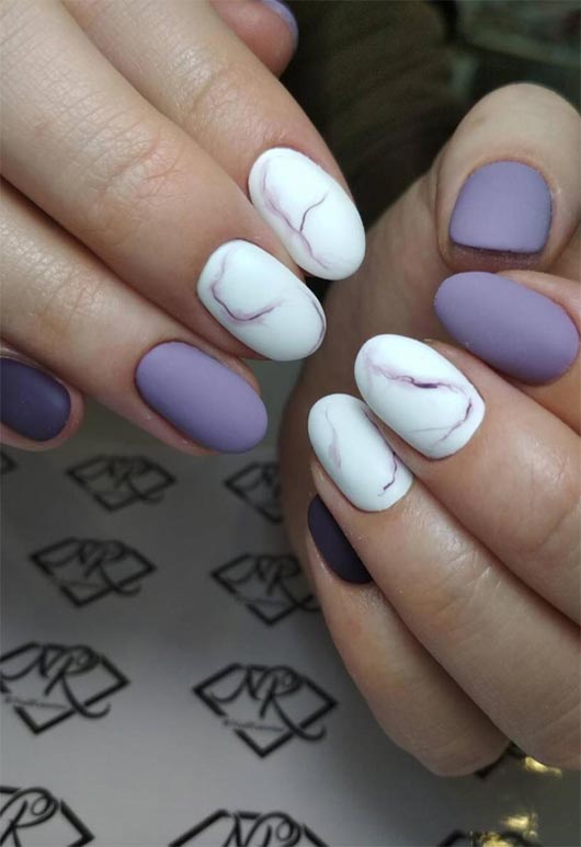 Corto, unghie ovali dipinte con lavanda e accentate da un'unghia prugna profonda e due unghie bianche con marmorizzazione viola creano un intelligente, manicure dall'aspetto morbido che smentisce la reputazione del marmo (e delle unghie) a cui siamo abituati. Anche se in realtà non sono morbidi, lo smalto opaco fornisce una trama e un aspetto interessanti.