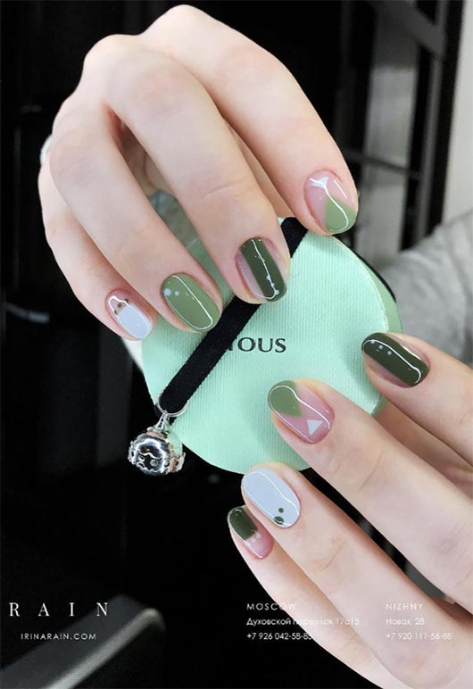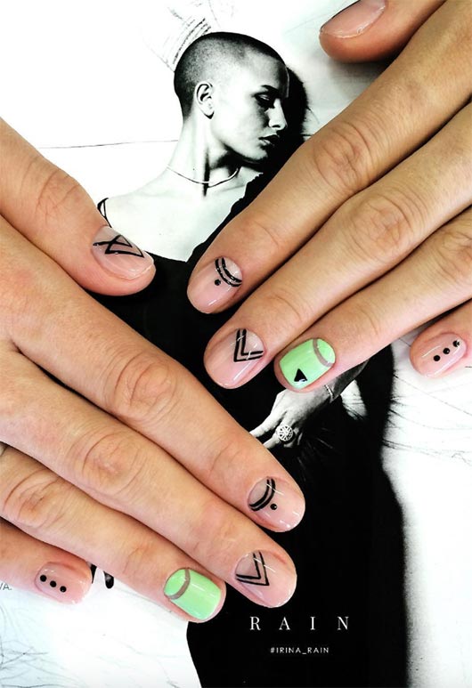Giocare con forme e disegni fa parte del divertimento della nail art. Le unghie più corte non sono esenti da divertenti design delle unghie, al contrario sembrano impacchettare di più in spazi più piccoli per un impatto maggiore. Tutte le sfumature di smalto verde utilizzate qui sono amplificate dalla finitura lucida bagnata del top coat.