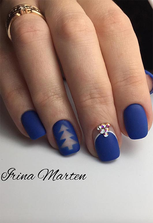 Matte è uno straordinario smalto per unghie che è inaspettato e in genere mostra un altro aspetto del colore su cui è dipinto. Anche qui il blu cobalto è fissato con qualche sassolino, un accento bianco e persino un design dello spazio negativo, e tutti questi elementi lavorano insieme magnificamente. Al di fuori dello straordinario design delle unghie corte, anche il blu cobalto è molto bello, colore ricco.