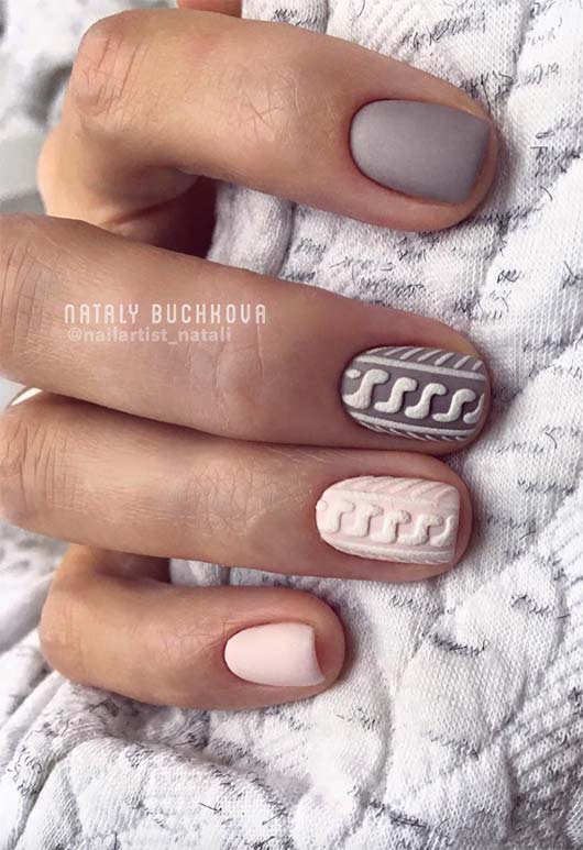 La manicure opaca ha un aspetto e una sensazione sorprendenti, ma l'aggiunta di un design in rilievo porta le cose a un altro livello. Giocare con le texture nei colori nude è di tendenza e probabilmente non andrà da nessuna parte, soprattutto se abbinato a uno splendido smalto opaco. Qui i disegni in rilievo sono accentati in bianco, che sta benissimo sopra gli smalti opachi grigi e nude.