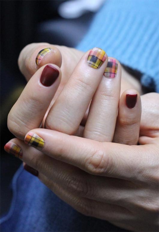 Le unghie accentate sono in genere le unghie uniche su una manicure, ma quando il design è a quadri è così ben fatto, il rosso rubino è invece un buon colore d'accento. Tre chiodi su ogni mano significano che la maggior parte dello stile è lo splendido e intricato plaid con il rosso rubino inserito.