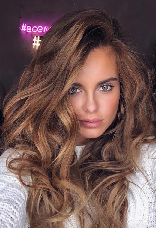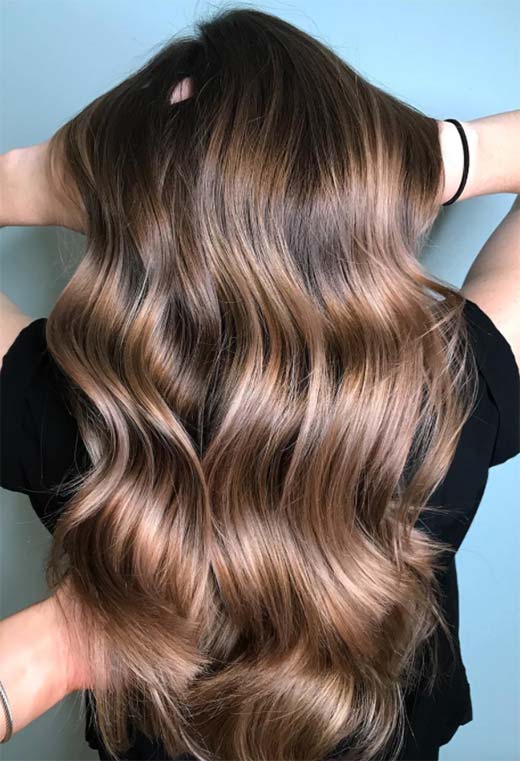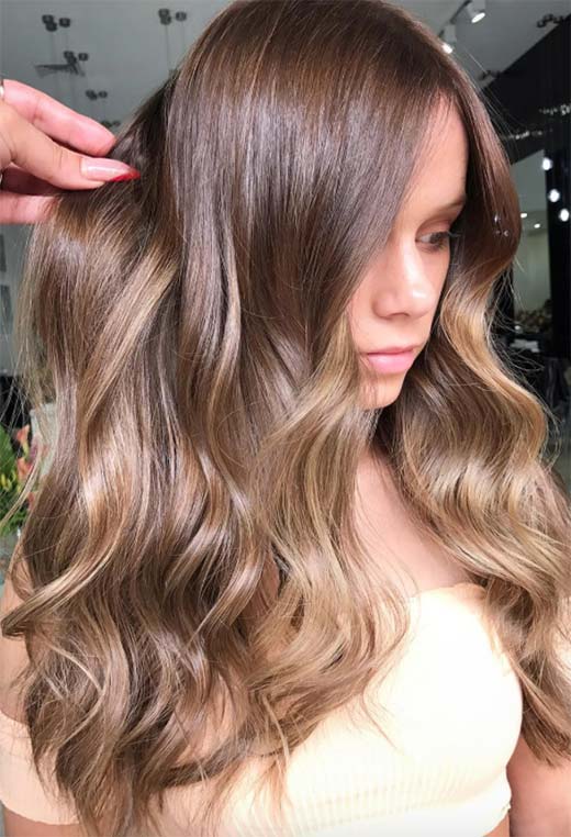 Acconciando i capelli in modo che siano sia arruffati che voluminosi, l'effetto finale sembra sexy senza sforzo. Questa variazione sul colore dei capelli castano chiaro è più profonda, radici marroni fredde che progrediscono in una tonalità cioccolato al latte che diventa quasi dorata alle estremità.