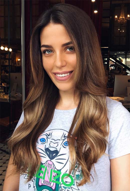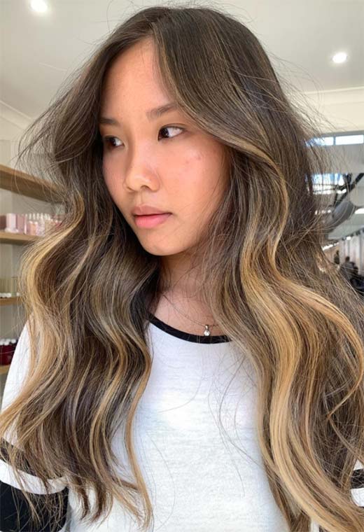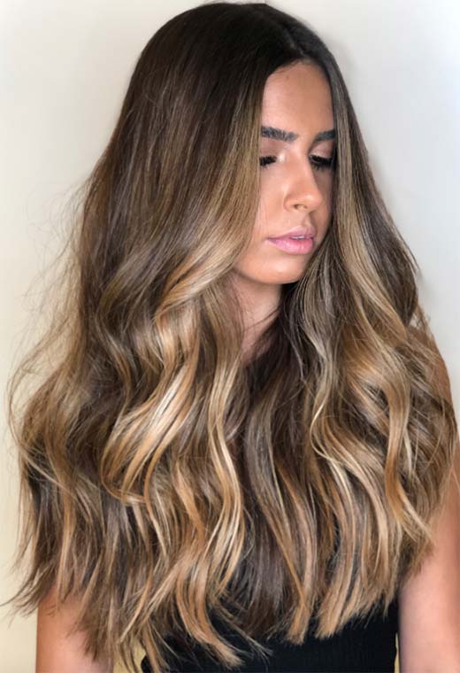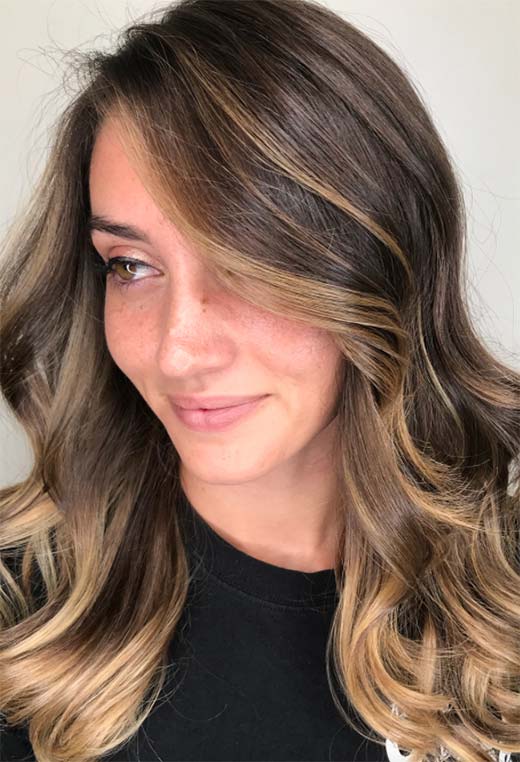 Questo stile è perfetto per l'estate con onde piatte e estremità rasate che sembrano ariose e rimbalzanti. Il colore qui è semplice ma sontuoso, con radici marroni che diventano progressivamente più chiare a metà e con un balayage di oro miele che aggiunge una lussuosa leggerezza.