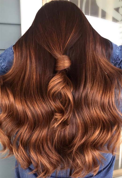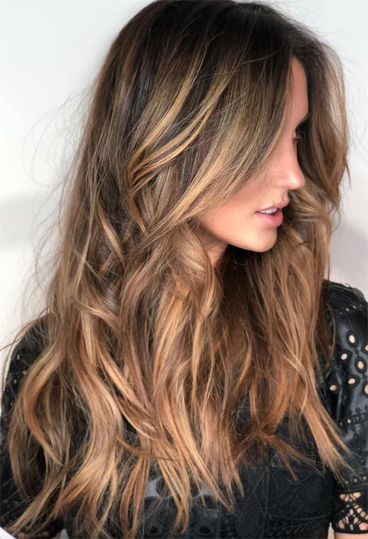 Questa è come una versione leggermente più tendente al rosso del look precedente, con un balayage su capelli estremamente lunghi che portano molto dramma. La tonalità di base è un marrone neutro con lunghe striature di un marrone chiaro miele che illuminano l'aspetto.