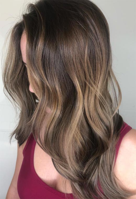 Questo è quasi lo stesso tipo di balayage del look precedente, ma la storia del colore marrone chiaro è leggermente diversa. Le radici sono una fredda tonalità marrone che si trasforma in una miscela di striature che includono sia i toni freddi del beige che quelli dorati.
