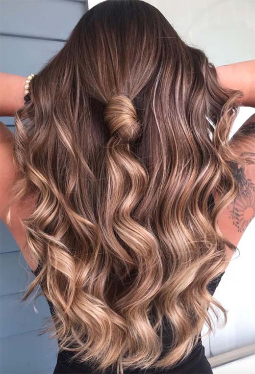Caffè espresso, i colori dei capelli oro e castano chiaro si uniscono per creare un look da spettacolo che è aiutato da quanto sono lunghi e sensuali i capelli. Le trecce ondulate erano principalmente tinte di marrone chiaro, ma alcuni viticci d'oro sul davanti aggiungono splendore, mentre le radici profonde aggiungono un effetto fumante.