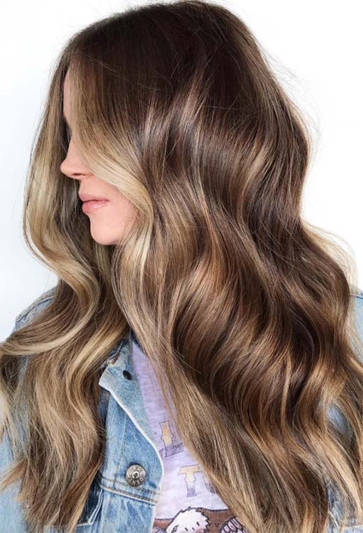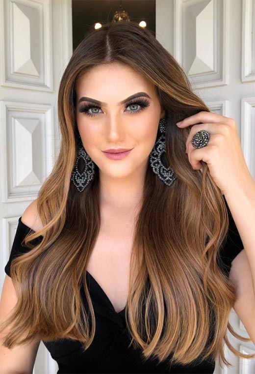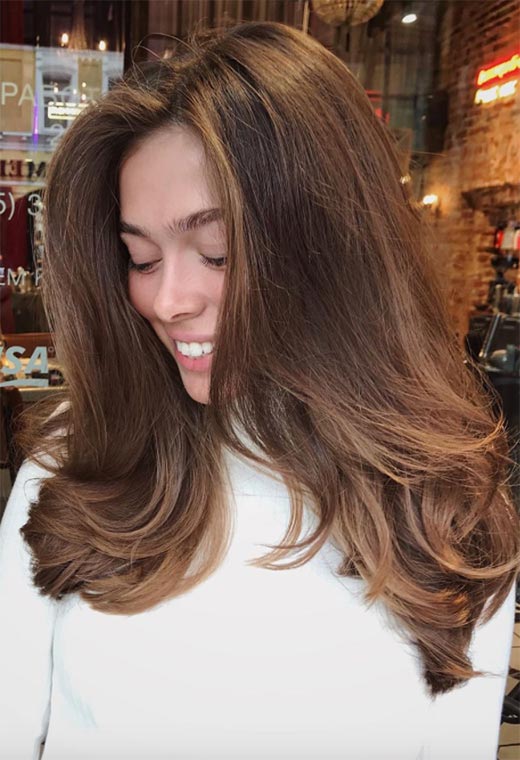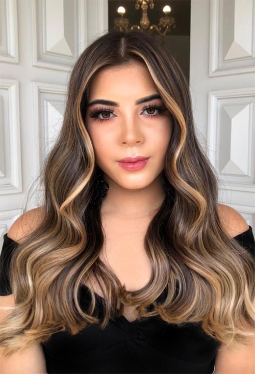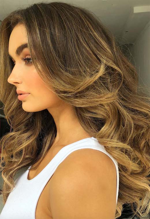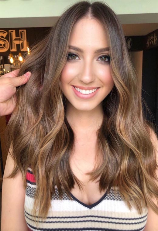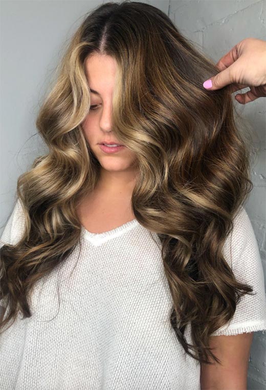 Questo è il tipo di capelli che fa impazzire le persone! Questo stile color castagna presenta profondi, radici color espresso con riflessi applicati in modo sottile in un ambiente caldo, tonalità marrone chiaro a base gialla. Le extension arricciate danno ancora più volume al look insieme a una sana dose di drammaticità.