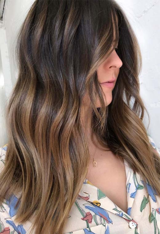 Questo look super carino è quasi cupo, con lunghe radici scure sostituite da un ricco marrone chiaro a metà, e alcune striature di biondo alla fine solo per un accenno di movimento. Disegnato in onde piatte, dimostra che i colori dei capelli castani possono essere altrettanto belli da spiaggia e perfetti per l'estate come i biondi!