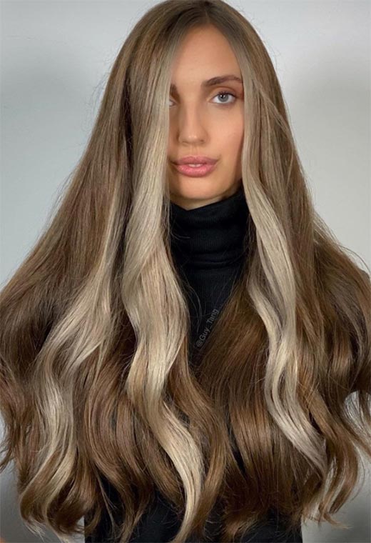 La combinazione di luci neutre marrone chiaro e riflessi beige in questo balayage è morbida e cremosa, come una combinazione di cioccolato bianco e al latte. Le radici extra scure aggiungono un po' di ombra, ma non tolgono alla leggerezza dello sguardo.