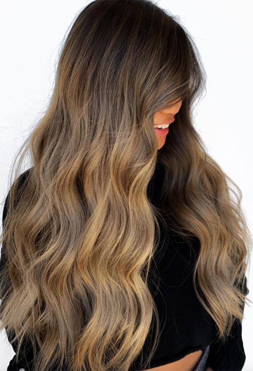 Questo splendido look di transizione presenta il meglio di tutti i mondi! Radici marrone scuro, medi marrone chiaro, e bionda alle estremità. Le sfumature dei capelli castano chiaro qui sono calde in un modo che lusinga le sfumature fredde.