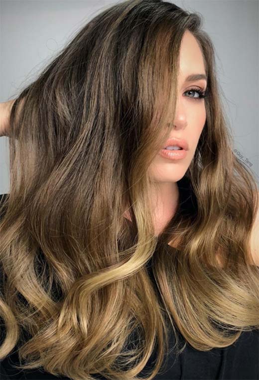 Questa è una di quelle idee per i capelli castano chiaro che ti faranno sentire come una dea abbronzata in qualsiasi momento dell'anno. La maggior parte dei capelli è in realtà piuttosto scura, ma una combinazione balayage di castano chiaro e biondo dorato dona un effetto metallico, effetto bronzo.
