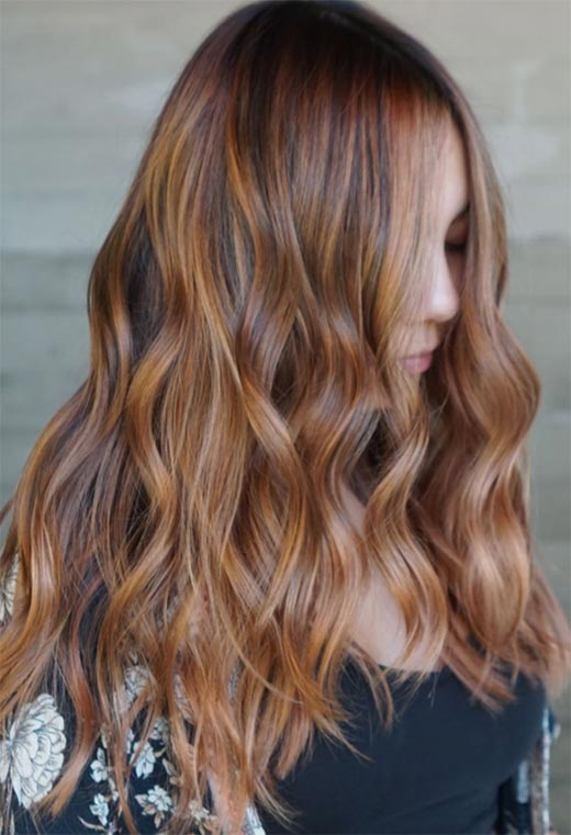 Questa interpretazione rossastra dei capelli castano chiaro ricorda la cannella o forse il peperoncino con alcune striature bionde allo zenzero sul davanti solo per incorniciare il viso. Adoriamo questo tipo di calore per l'autunno, mentre le onde dall'aspetto morbido sono fantastiche in qualsiasi periodo dell'anno.