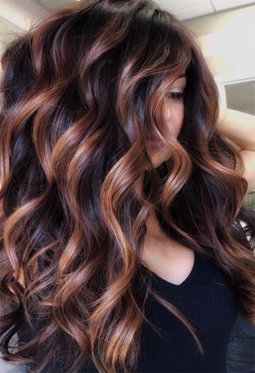 Quando combini molta lucentezza con i capelli castano scuro, finisci con il bronzo, un metallo caldo ma scuro che attira molta attenzione. Questa tonalità calda è stata aggiunta ai capelli con un balayage pesante che non è per i deboli di cuore.