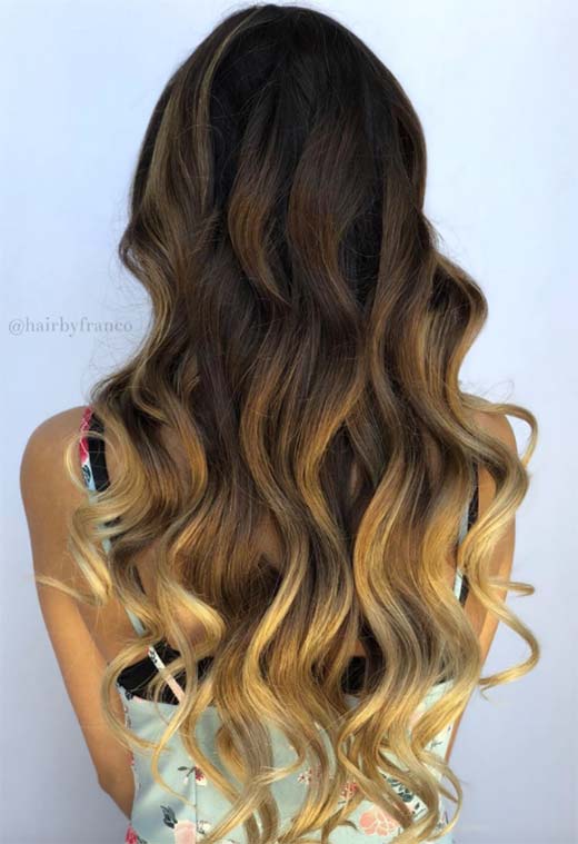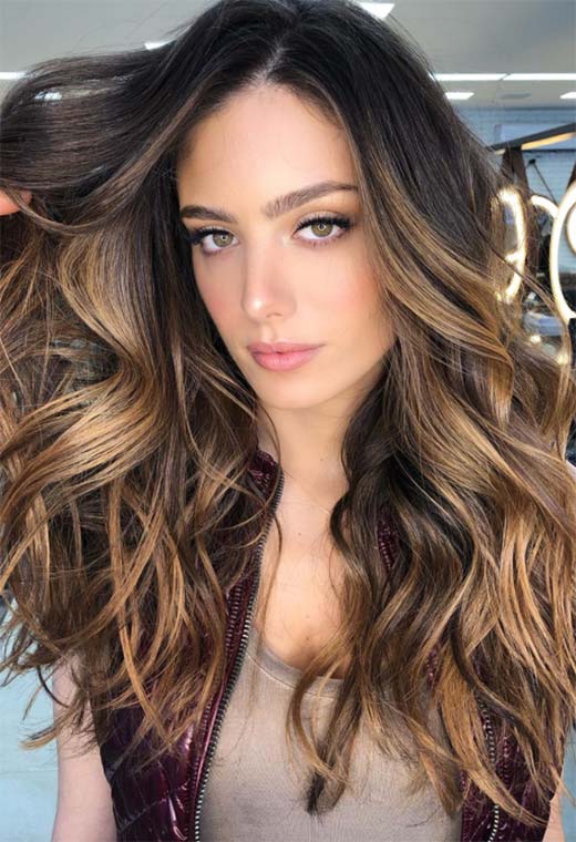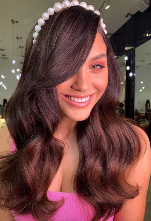 Acconciare i capelli in onde unidirezionali è il vero segreto per sentirsi una principessa, anche se aiuta anche un bel colore di capelli. La base dei capelli è un marrone cioccolato intenso con un sombré ramato con striature molto sottili che aggiungono consistenza.
