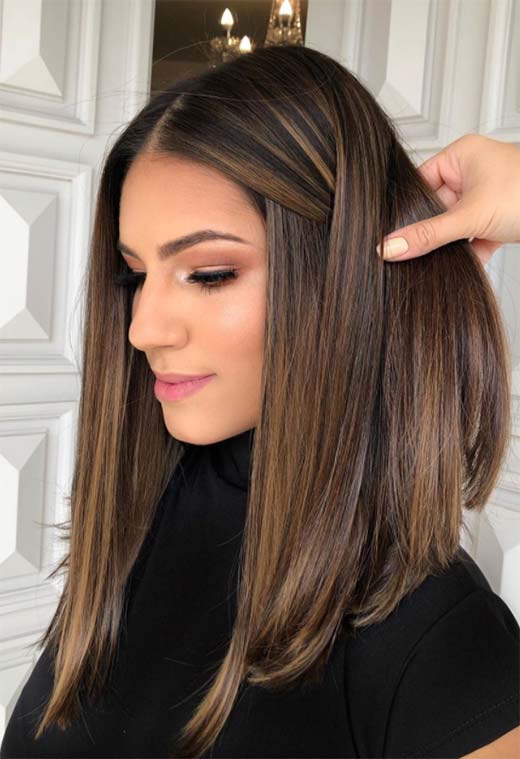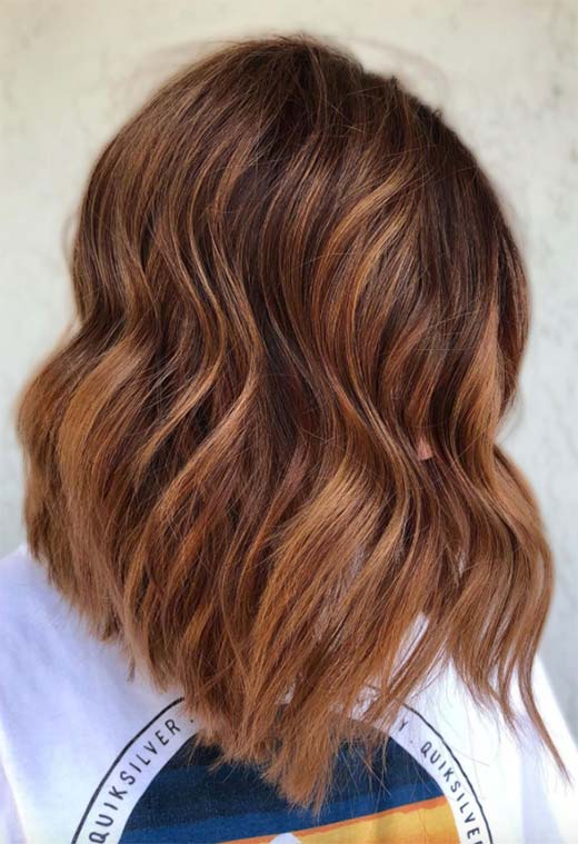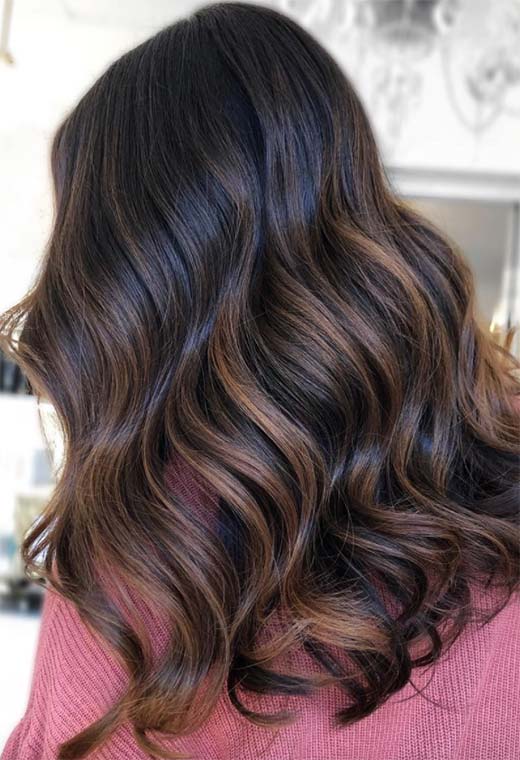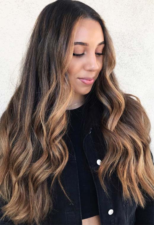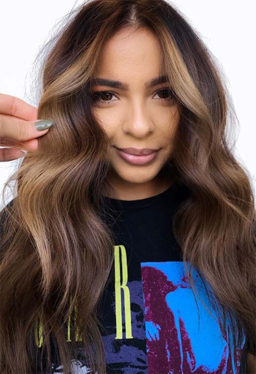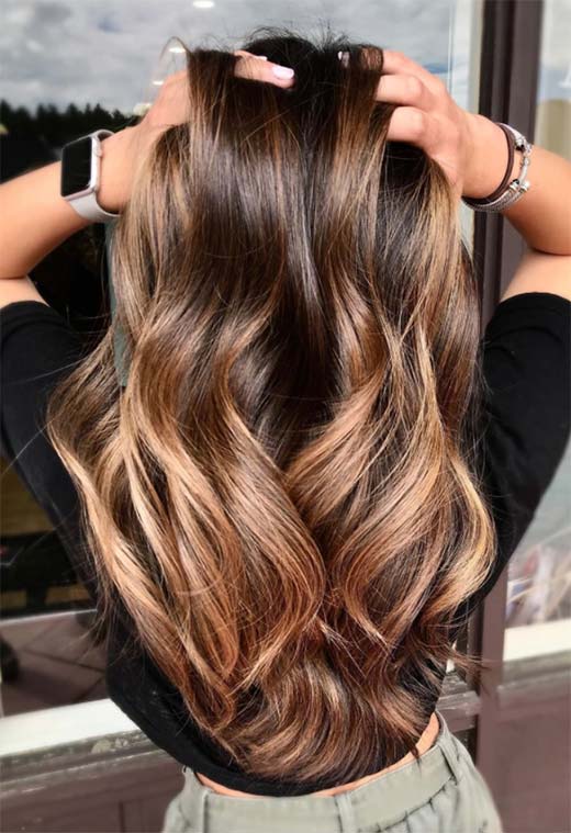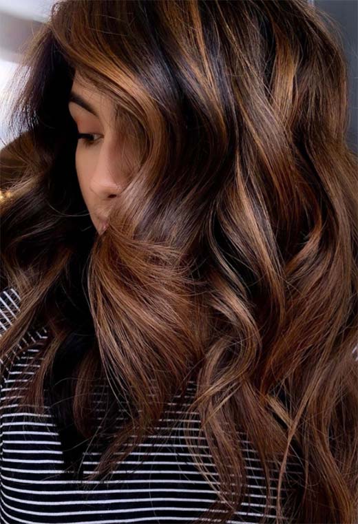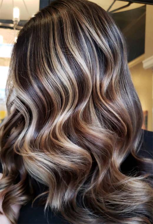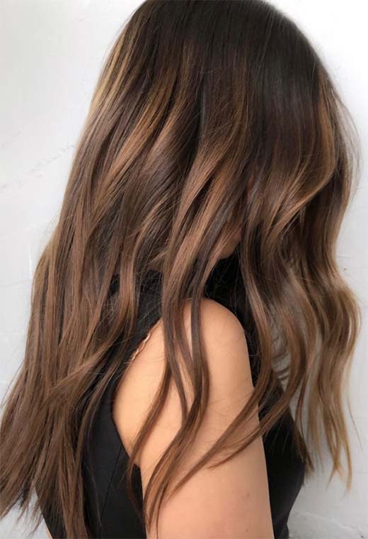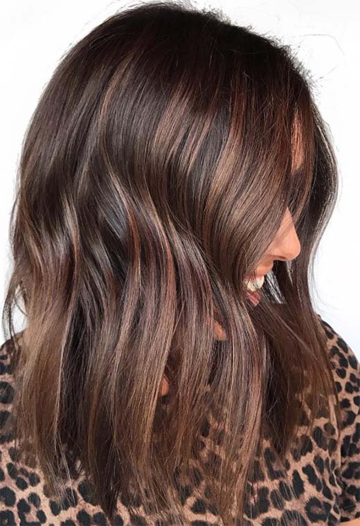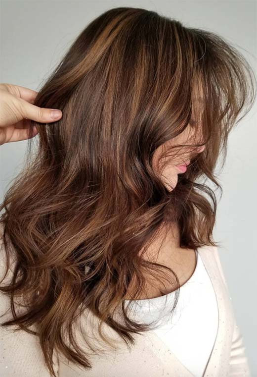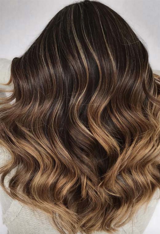 Morbido, gentile, liscio:queste sono le parole che ci vengono in mente quando guardiamo questa bella acconciatura! Le onde sono così naturali, e la combinazione di sfumature di caffè espresso e cioccolato al latte è cremosa e deliziosa, con qualche strana striscia d'oro che illumina le cose.