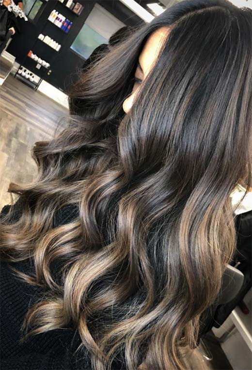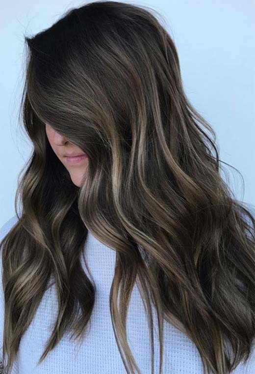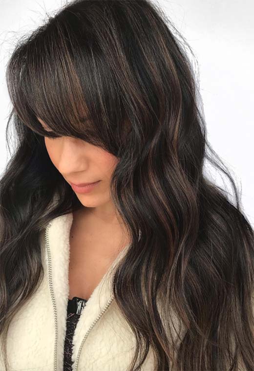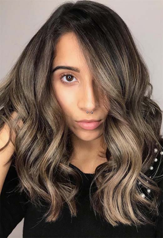 Adoriamo questa variazione strutturata e opaca sui capelli castano scuro. I toni profondi sono davvero al comando qui, dal colore quasi nero a cui viene data dimensione sotto forma di striature bruno cinereo. Combinato con frangia laterale e onde soffici, è un look moderno e carino.
