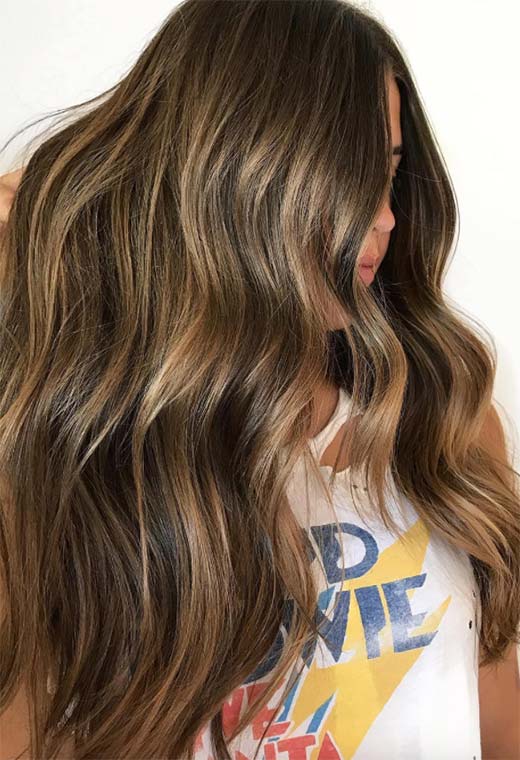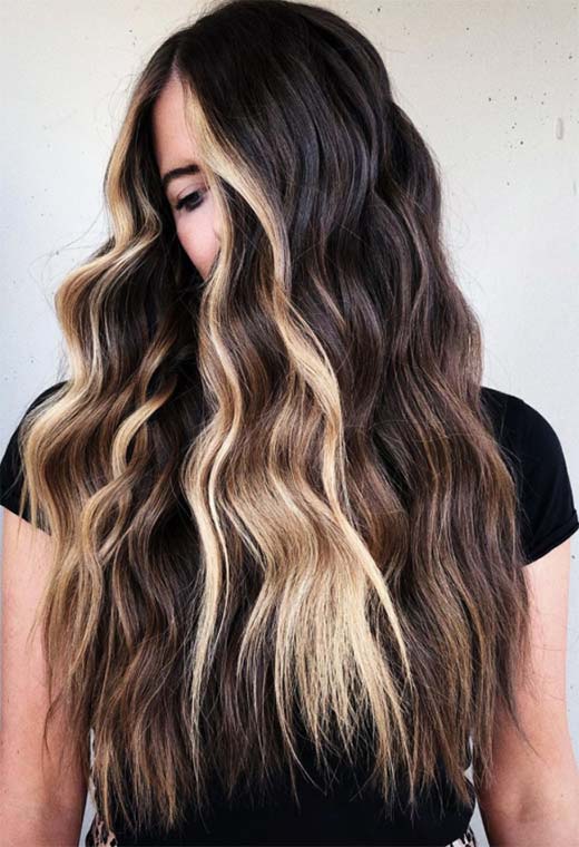 Qualche ciocca di biondo paglia è tutto ciò che serve per sentirsi una ragazza da spiaggia anche quando si dondolano i capelli castano scuro. Le striature sottili aggiungono consistenza, mentre quelli spessi nella parte anteriore illuminano il viso. Le splendide onde sciolte e i bordi rasati sono ciò che mantiene questo look perfettamente ventilato.