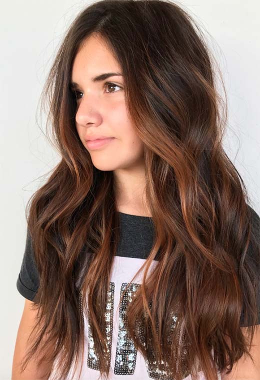 Questa è un'altra versione delle meches color pesca che aggiungono una sensazione gioiosa ai capelli castano scuro. Se hai sempre voluto sperimentare con i pastelli, questo è un modo facile e sempre appropriato per farlo. Questo look è magnifico grazie agli strati extra lunghi, ma starebbe altrettanto bene sui capelli più corti.