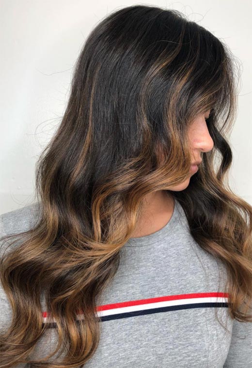 Questa è una combinazione unica di colori per capelli che non si vede spesso nelle acconciature marrone scuro. C'è una base nera tra i capelli che tende verso il freddo, con striature caramellate di media grandezza che aggiungono calore contrastante, facendo brillare i capelli.