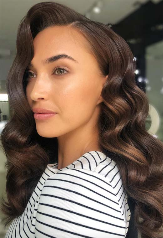 L'età d'oro di Hollywood ci offre un'infinita fonte di ispirazione per la bellezza, come questo splendido look per capelli castani. La parte laterale profonda e l'onda romantica di Marcel sono senza tempo, ma l'occasionale striscia di caramello è un tocco moderno.