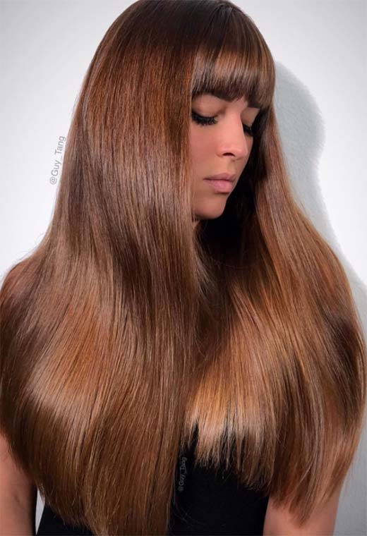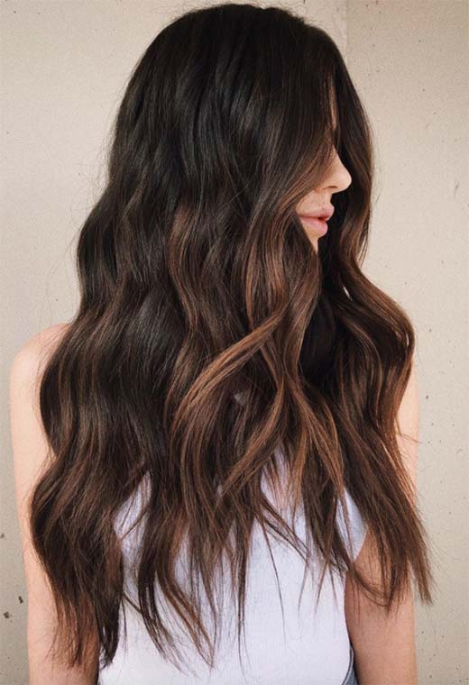 I capelli lunghi acconciati in onde lisce saranno probabilmente fantastici, non importa il colore. Ecco perché queste ciocche color cioccolato sembrano regali, anche se dobbiamo ammettere che anche quelle strisce dorate a metà e fine aiutano.