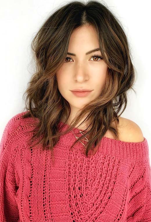 questo peloso, il long bob a strati è un taglio di capelli davvero divertente e civettuolo, perfetto per rendere i capelli leggeri ma voluminosi. Il colore dei capelli castano scuro, che viene accuratamente evidenziato con toni di cioccolato al latte, enfatizza la consistenza dei capelli.